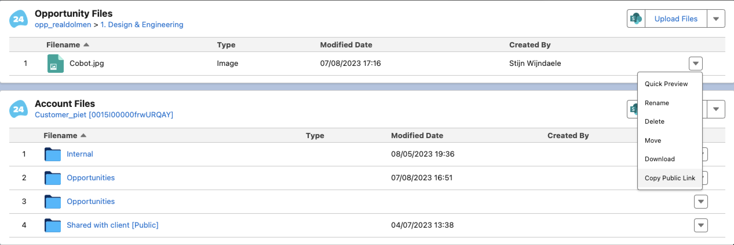 Description: By clicking on the “Copy Public Link” button in the dropdown, a public shareable link will be generated and copied to your clipboard. The link allows to download the file.