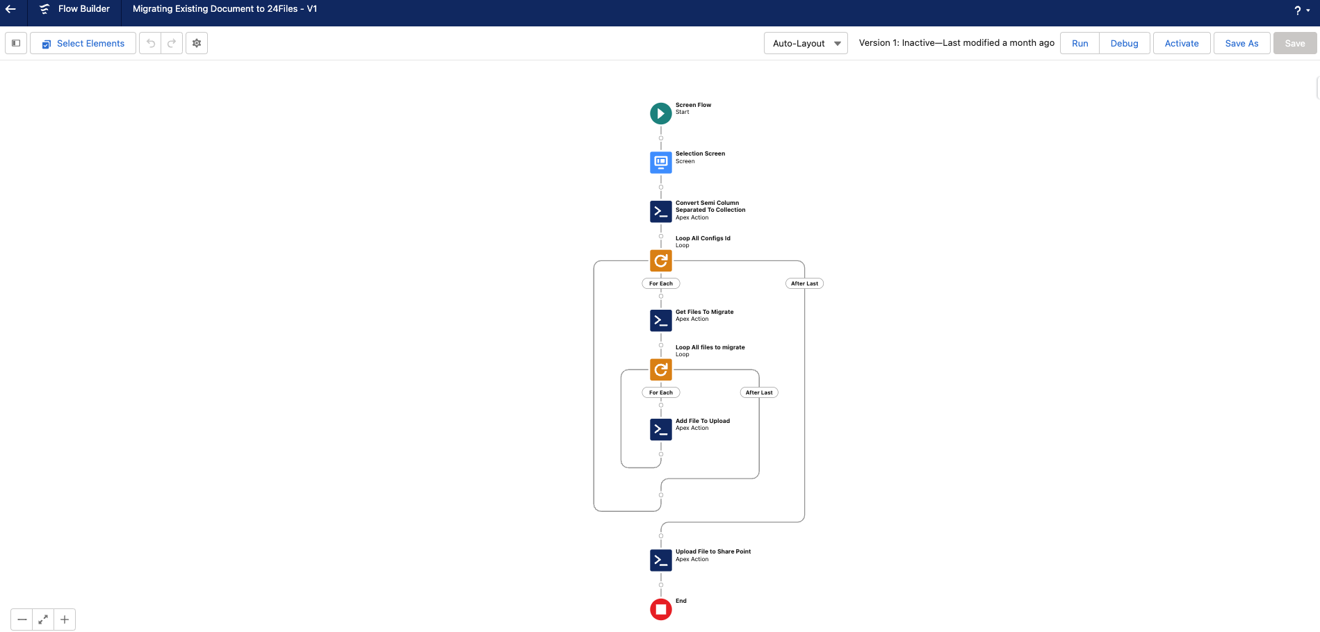 An example flow is added as an example on how you can use our global functions to perform a migration using 24Files. The flow will retrieve records from a type (e.g. contacts) and creates the default folder structure for those records. After this is done, the Salesforce documents are uploaded to SharePoint.