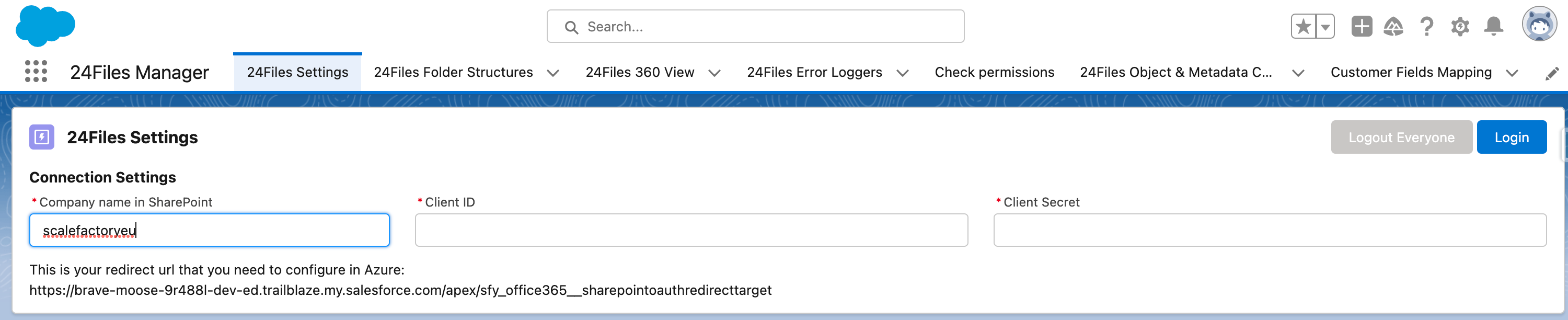 Go to 24Files settings in Salesforce and paste the ‘company name in SharePoint’ (eg scalefactoryeu, this is the first part of the URL configured in Remote Site Settings), Client Id and Client Secret. Don’t click on the Login button yet.